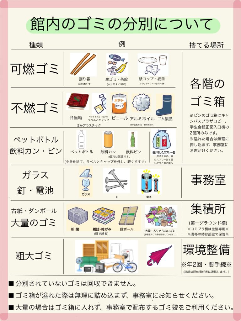 通常の可燃ゴミ・不燃ゴミ・ペットボトル・缶・ビンのゴミについては、館内のゴミ箱に捨てることができますが、その他のゴミについては以下の点に注意して処分するようにお願いします。